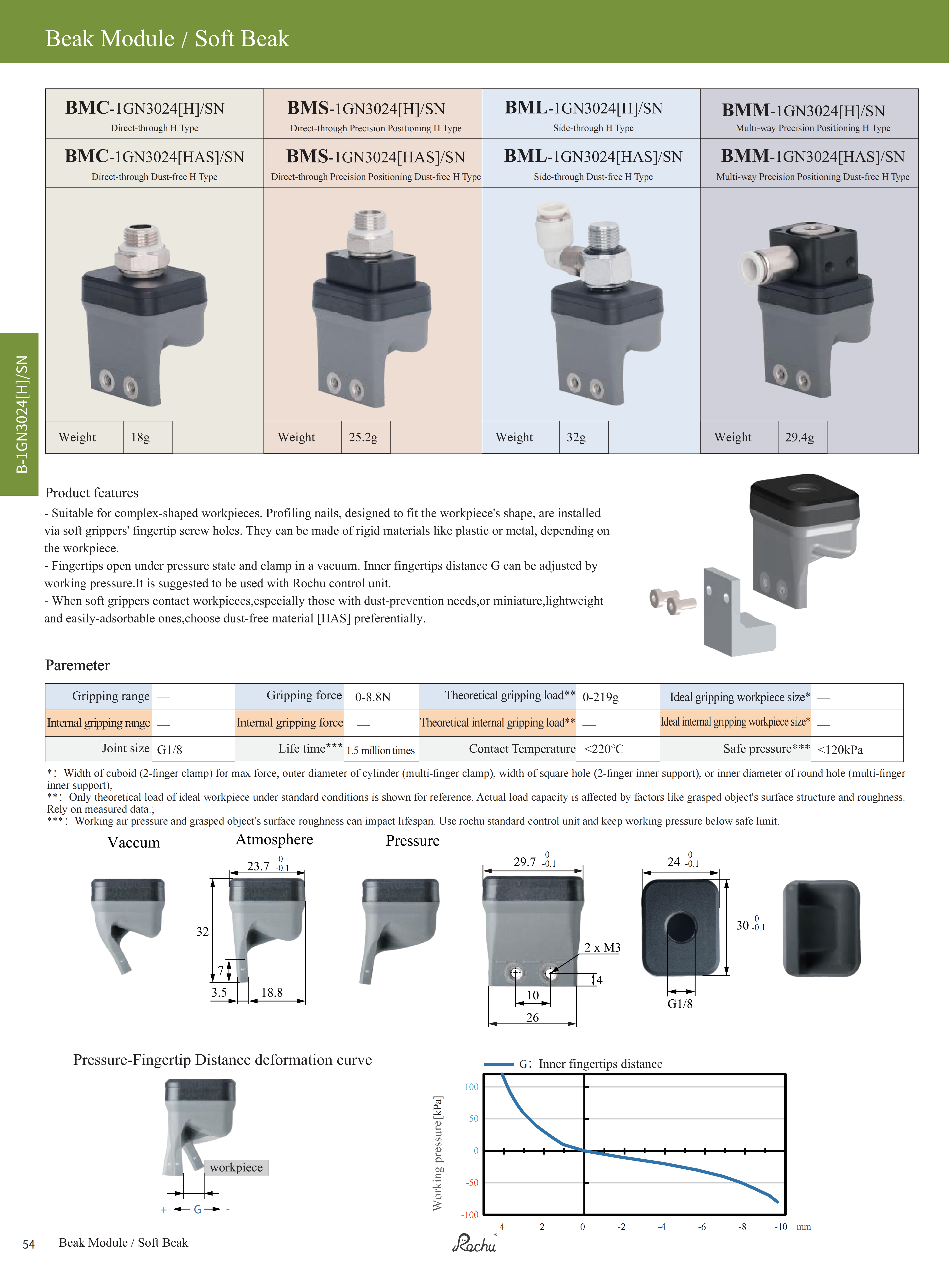 Fingertip open under positive pressure and clamped under negative pressure. It is suggested to be used with Rochu controller.