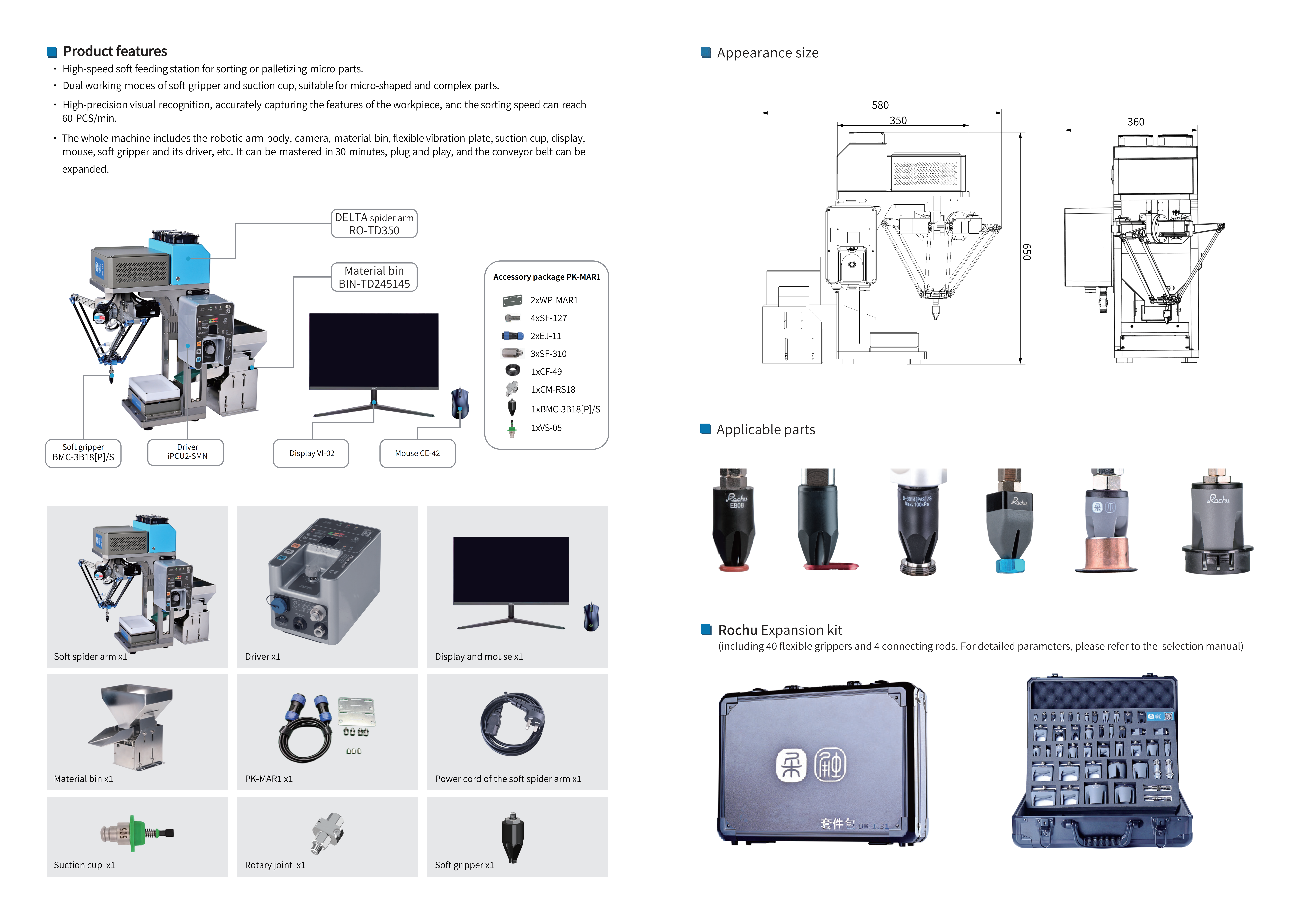 Se trata de una máquina inteligente todo en uno que integra pequeños robots delta, cámaras visuales industriales, un sistema de alimentación y software informático. Puede identificar de forma inteligente piezas pequeñas y luego organizarlas de forma ordenada mediante brazos robóticos precisos y de alta velocidad. No importa la parte delantera o trasera de la pieza, puedes verla claramente de un vistazo. Este producto puede mejorar la eficiencia y reducir los costos para usted. La interfaz de operación es simple y fácil de usar, lo que reduce el umbral para usar productos de automatización y aumenta la flexibilidad.